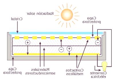 - En la energía solar fotovoltaica, la luz del sol incidiría sobre una célula fotovoltaica que produce energía eléctrica directamente.